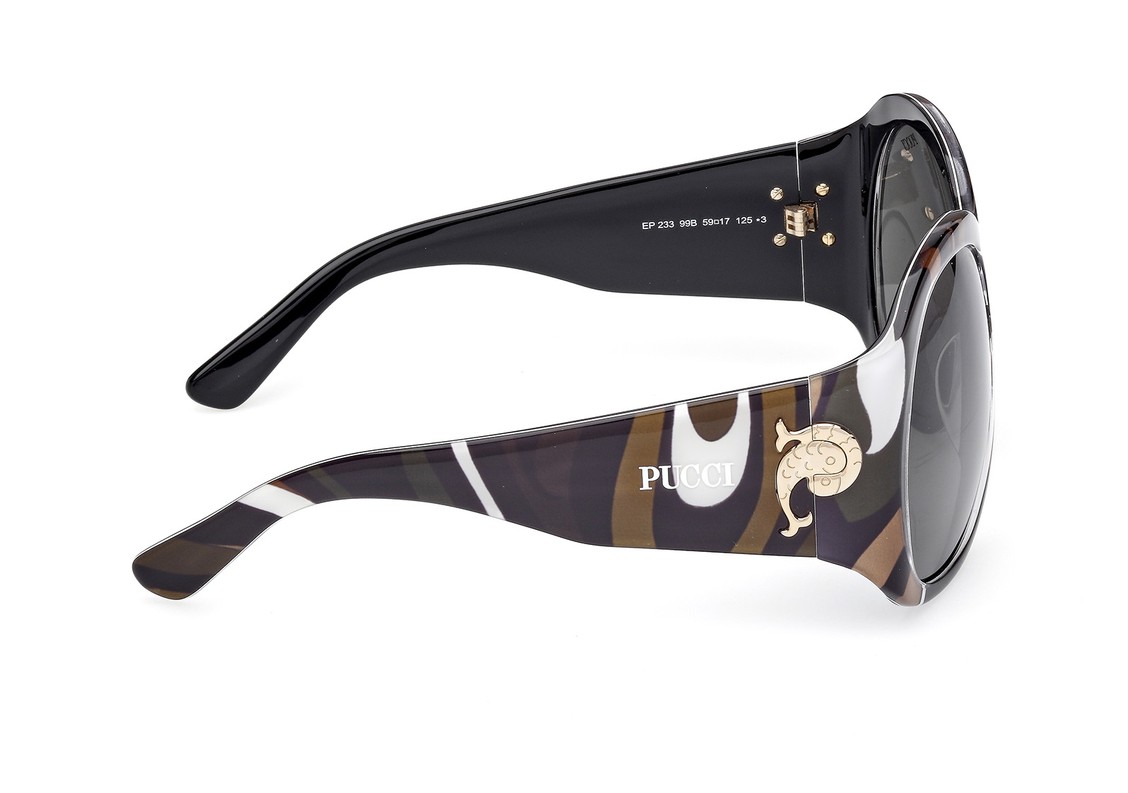 Кому подойдут: стильным девушкам и женщинам, ценящим премиальные аксессуары, универсальный чёрный цвет с фирменным принтом Pucci и надежную защиту глаз от солнца.